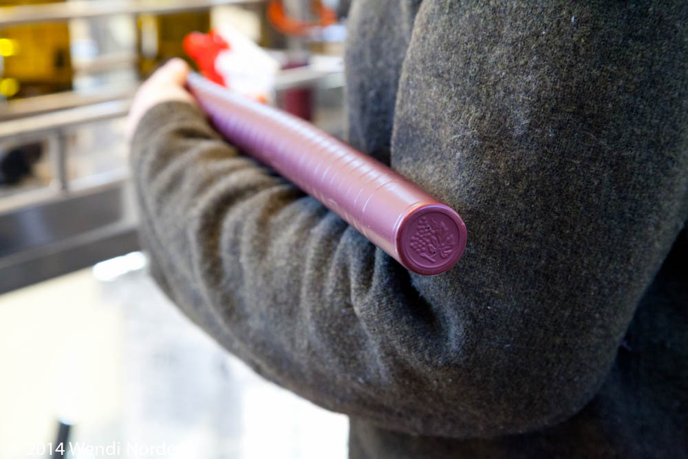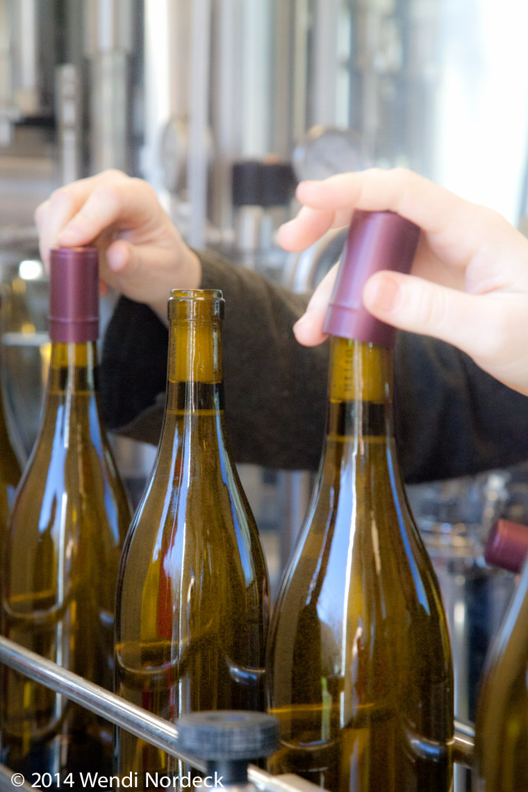 Along this highly efficient and gloriously mechanized line, there’s one other point where a volunteer is usually needed. And that’s where Wendi and I came in. Those foil caps you have to cut away before opening your wine? We put those on by hand. After the corks were inserted by the machine, it was our job to swiftly slide a cap onto each bottle before it went to another station on the line that molded the cap to a snug fit.