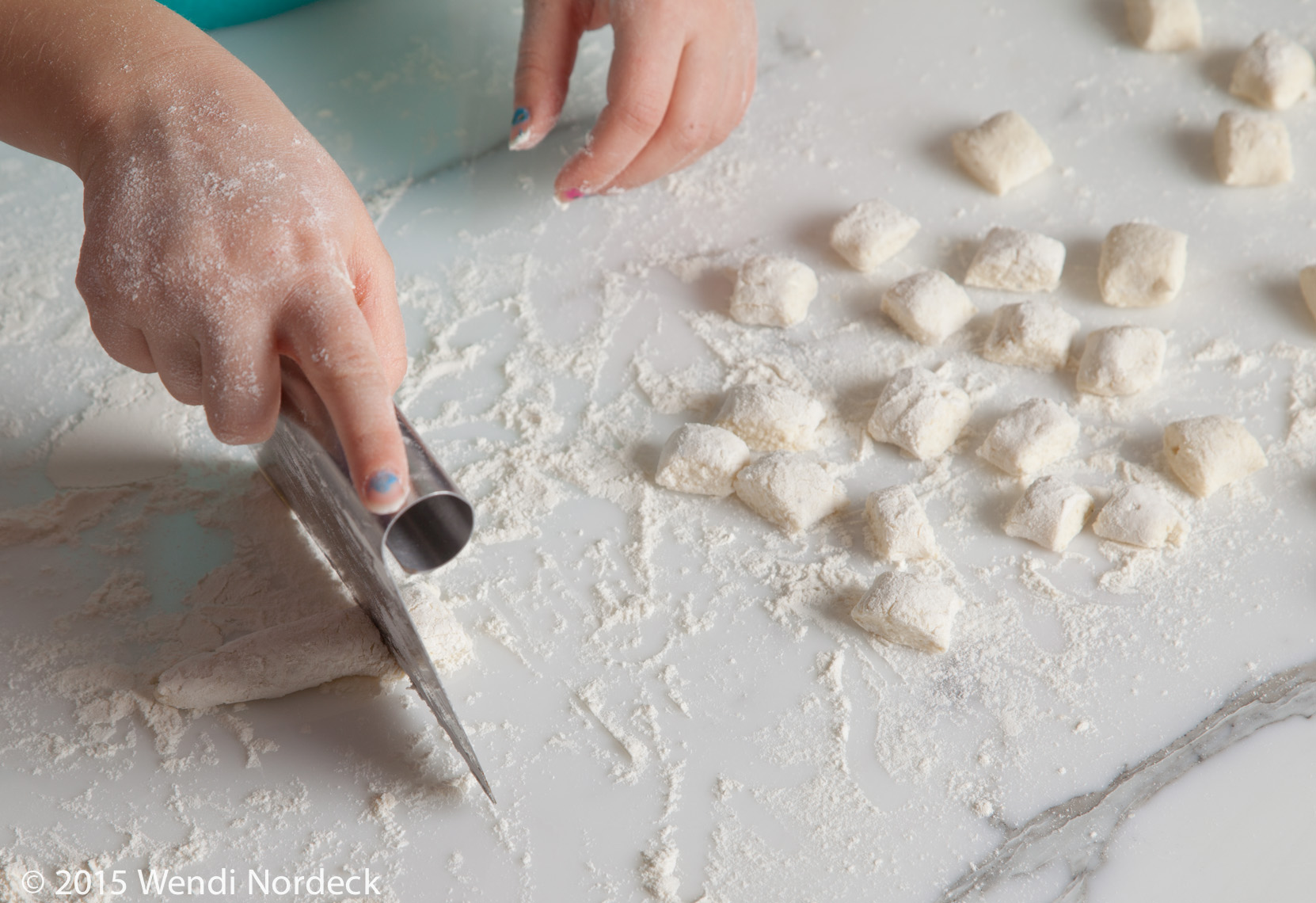 Line a rimmed baking sheet with parchment paper. On a lightly floured work surface, gently roll one handful of dough into a rope 1/2-inch thick. With a bench scraper or knife, cut the rope into 1-inch pieces.