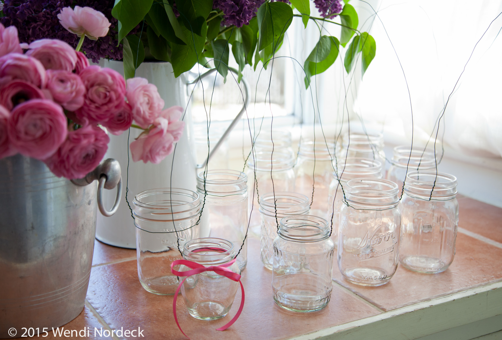 Instead of paper cones, which won’t hold water to keep the blooms fresh, we prefer using glass jars, whether they’re old jelly jars we’ve been saving up, or a new batch of canning jars from the store. To make the hanger, we use floral wire, which is thin, coated and easily available at craft stores.